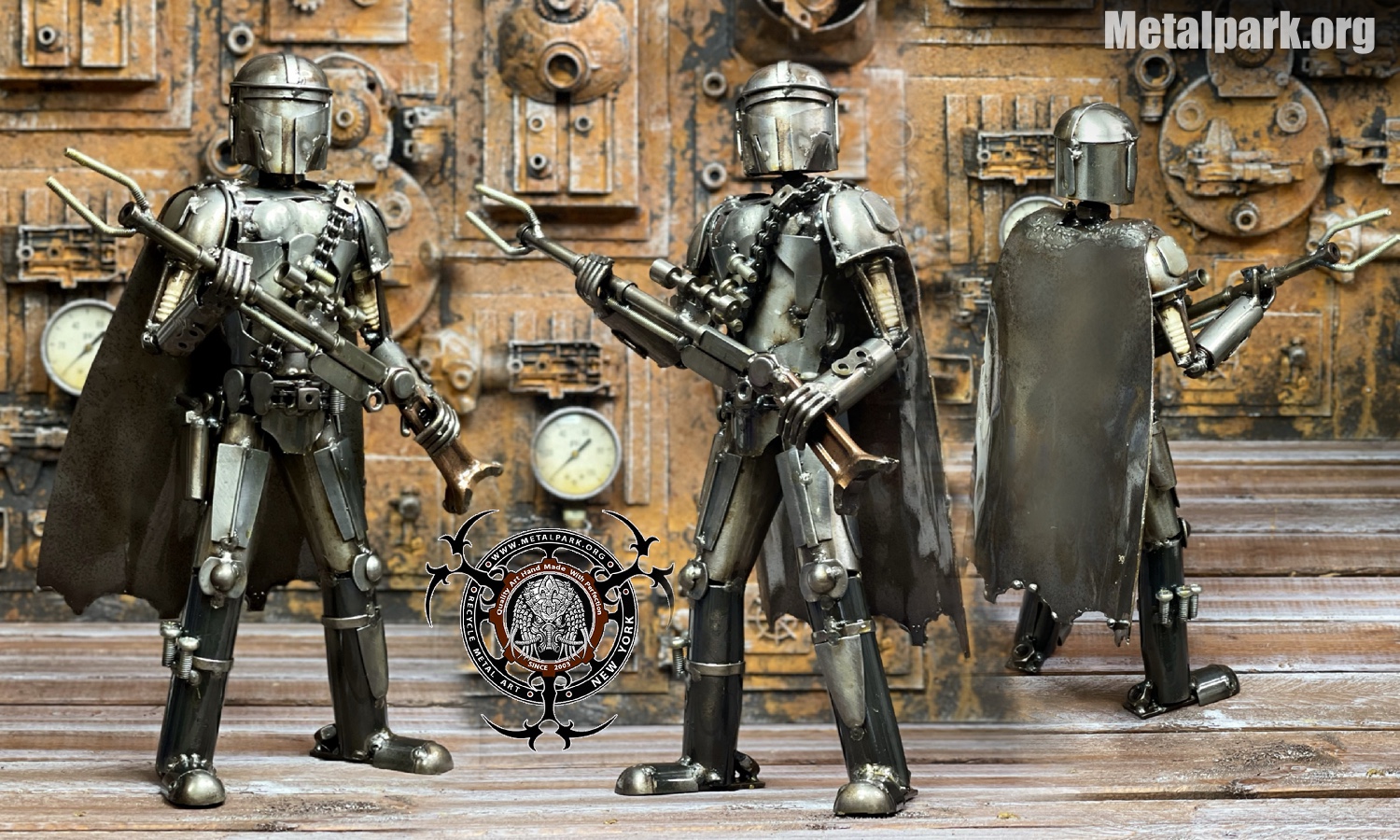 This handcrafted sculpture captures the silent strength of a lone Mando hunter. Built entirely from recycled motorcycle and car parts, every detail is assembled by hand and finished with wire-brush polish. The head is moveable, adding a subtle interactive feature that brings the character to life.
