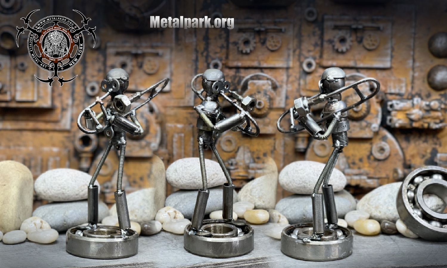 Bring music and industrial charm into your space with this handmade metal sculpture of a trombone player.